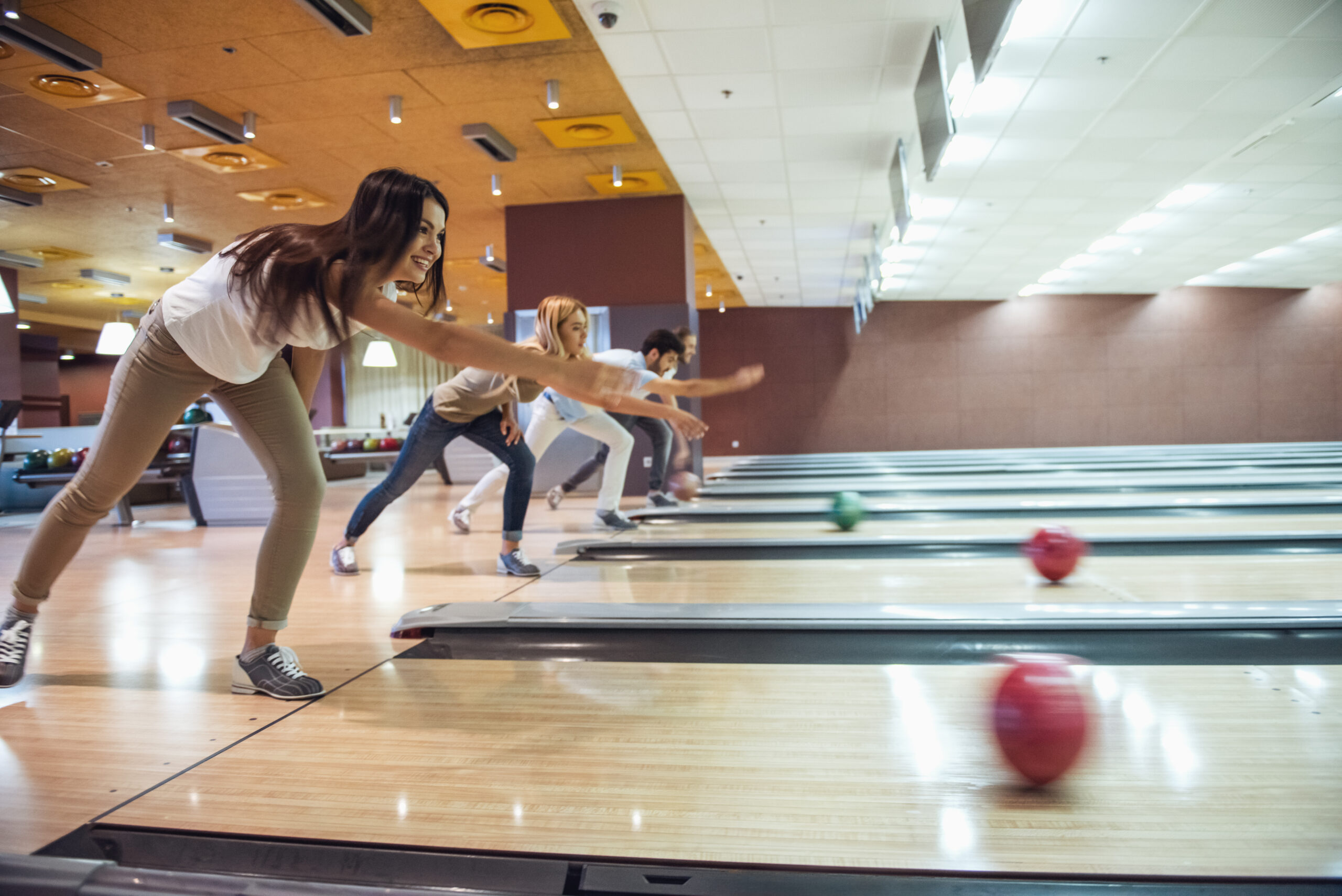Happy young friends are having fun while playing bowling together